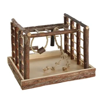 La plaque de base en bois naturel permet à l’aire de jeu de devenir un site d’approche idéal en dehors de la cage.