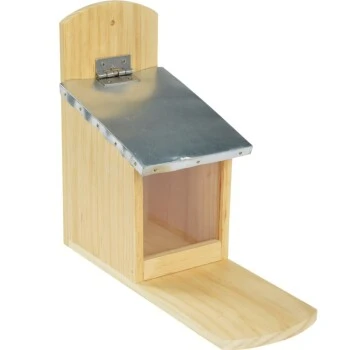 La station d’alimentation en bois dispose d’une vitre en verre acrylique intégrée , qui protège la nourriture des écureuils des influences extérieures. Le couvercle peut être remonté lors du remplissage et du nettoyage.