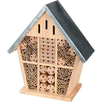 Le nichoir rempli de tiges de bambou est fabriqué en bois dur et soutient ainsi les abeilles sauvages et autres insectes qui contribuent de manière importante à la pollinisation. Les bords lisses augmentent les chances d’une colonisation et le toit métallique protège contre les intempéries. L’hôtel à insectes doit être suspendu dans un lieu ensoleillé et protégé du vent et de la pluie. Une orientation vers le sud et une hauteur d’au moins 50 cm sont idéales. L’hôtel à insectes doit être laissé à l’extérieur toute l’année.