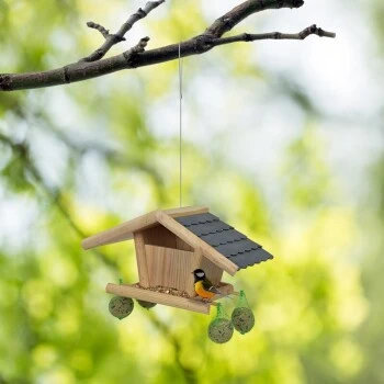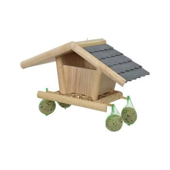 Le nichoir AniOne est doté d’un toit en saillie pour protéger la nourriture de l’humidité et offre également la possibilité de suspendre 4 boulettes de graisse. Le nichoir résiste aux intempéries.