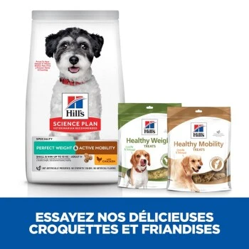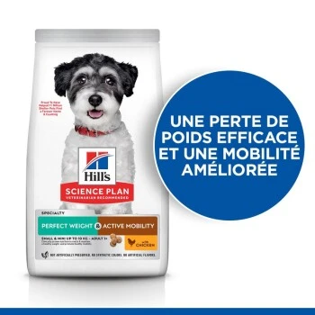 Appliquer un régime hypocalorique à votre chien adulte peut être difficile pour vous et votre quadrupède. C’est pourquoi Hill’s Science Plan Perfect Weight Active Mobility Adult Small & Mini pour chien au poulet fournit une alimentation savoureuse et révolutionnaire pour la gestion du poids, qui offre un plaisir complet à votre chien adulte. Avec des protéines pour maintenir les muscles fins et l’huile de poisson cliniquement prouvée, riche en acides Omega-3-pour soutenir la mobilité des articulations, cette nourriture pour chien est le repas parfait dans la gamelle de votre chien adulte. Cette nourriture pour chien pour un poids sain a été développée à l’aide de décennies de recherches les plus récentes et fournit à votre chien adulte des repas savoureux qu’il peut pleinement apprécier.