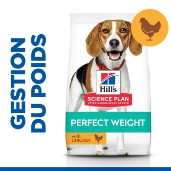 Adopter un régime pauvre en calories pour votre chien adulte peut être bénéfique pour vos deux. C’est la raison pour laquelle HILL’S SCIENCE PLAN Perfect Weight Adult propose une nourriture pour chien savoureuse et digeste pour la gestion du poids que votre chien appréciera.