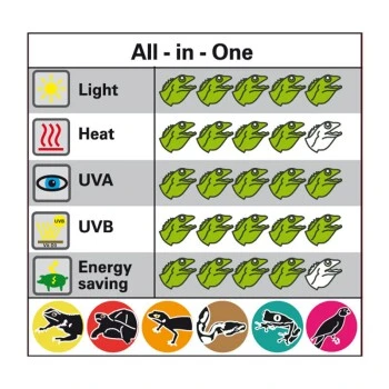 Les essais de Lucky Reptile ont montré qu’un spectre de lumière du jour avec une température de couleur d’env. 6 000 K était préférable pour les reptiles de désert. Cet élément a été pris en compte dans le développement du Bright Sun UV Desert. La lumière blanche lumineuse est très appréciée par les animaux et l’ampoule offre tout ce dont les reptiles de désert ont besoin. La chaleur, le rayonnement UV et l’intensité lumineuse ont été conçus de telle sorte que les meilleurs résultats soient obtenus dans différents types de terrariums grâce aux puissances adaptées. Les graphiques de distance indiquent le modèle adapté à chaque terrarium.