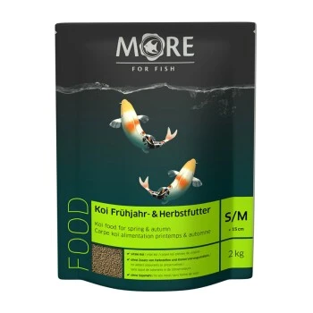 L’Alimentation Printemps/Automne P/M est une nourriture premium spécialement développée pour l’alimentation quotidienne au cours des saisons transitoires, le printemps et l’automne. C’est justement lors des saisons transitoires que les carpes koï ont besoin d’une alimentation fortifiante et facile à digérer. MORE FOR FISH contient des ingrédients d’une grande valeur nutritive, très digestes et adaptés aux besoins de l’espèce, dont de la précieuse huile de poisson et renonce à l’utilisation de farine de soja difficilement métabolisable. Par ailleurs, la nourriture flotte longtemps à la surface de l’eau, ce qui invite à observer le comportement des poissons.