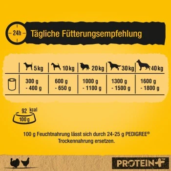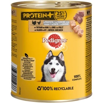 La nourriture pour chien PEDIGREE avec nourriture pour chien PROTEIN + contient 25 % de protéines en plus par rapport aux autres aliments pour humides en boîte de PEDIGREE. Nos formules de nourriture humide pour chiens sont fabriquées avec des ingrédients NATURELS, des vitamines et des substances minérales et sont de la nourriture pour chiens 100 % COMPLÈTE et SAINE.