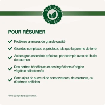 Cet aliment complet de haute qualité contient une, deux ou au maximum trois sources différentes de protéines animales, des composants d’origine végétale de la meilleure valeur nutritive, tels que de la pomme de terre ou des pâtes complètes, et de précieuses huiles dont les acides gras oméga 6 essentiels peuvent contribuer à la bonne santé de la peau et du poil.